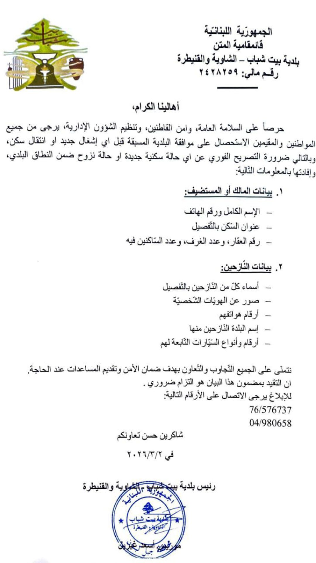 حرصاً على السلامة العامة، وامن القاطنين، وتنظيم الشؤون الإدارية، يرجى من جميع المواطنين والمقيمين الاستحصال على موافقة البلدية المسبقة قبل أي إشغال جديد أو انتقال سكن، وبالتالي ضرورة التصريح الفوري عن أي حالة سكنية جديدة أو حالة تزوّج ضمن النطاق البلدي، وإفادتها بالمعلومات التالية: